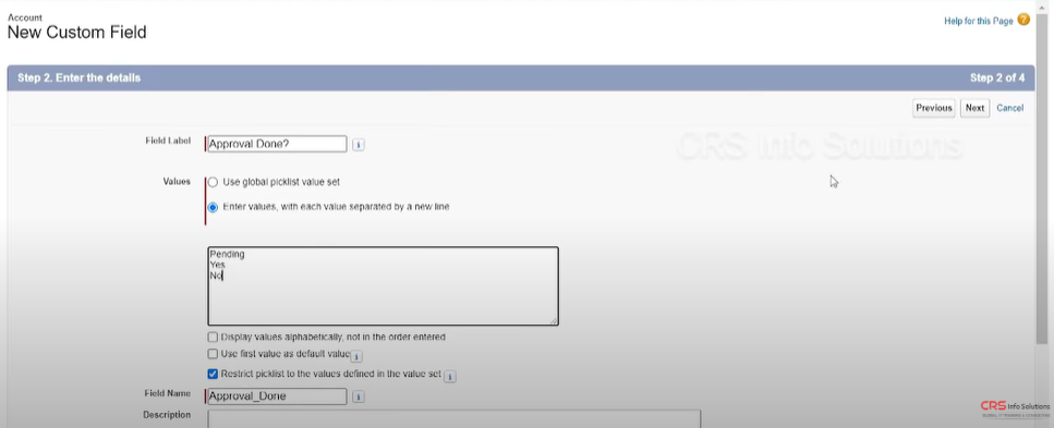 Before the process configuration, we want to introduce a new field to the Account object to display the approval status of the record. For this, we create a new Pick list field named “ApprovalDone?” and use values Pending, Yes, and No as statuses.