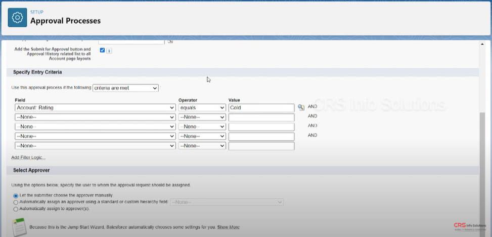 In this example, we’re going to set up an approval process for the Rating field in the Account object. We want it to seek approval whenever the rating of the record is set to Cold.