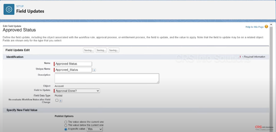 Here, you can again select ApprovalDone? as the field to update and select Yes as the picklist value option.