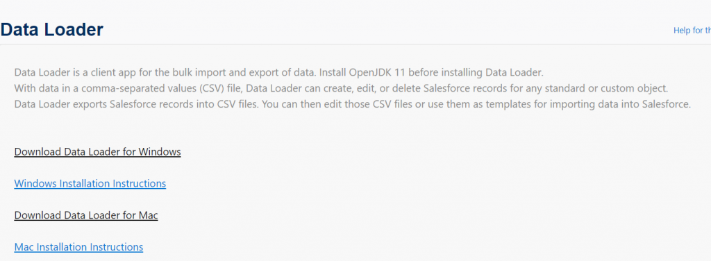 Data loader is an application which is mainly used when bulk import/export of data is required. Basic operations insert, update, upsert and delete can be done with the help of data loader. It only supports csv files for reading the data and also exports the data in form of csv only. If comma’s you can’t use then you can change the data loader settings in settings tab.