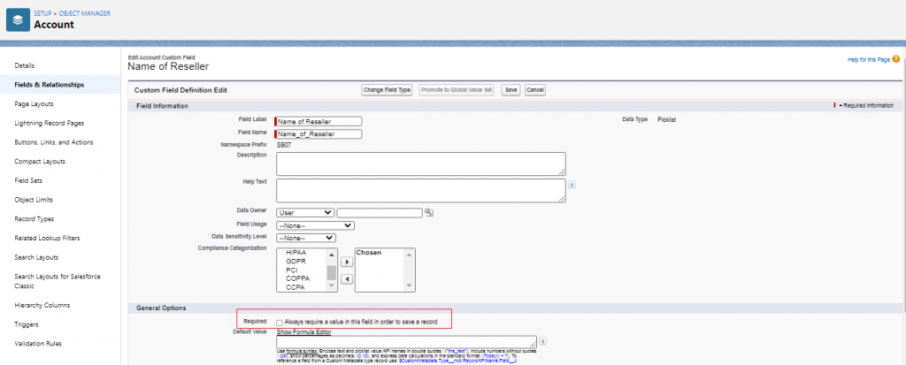 5. In the section “General options”, flag the “Required” checkbox as selected. (Description as “Always require a value in this field in order to save a record” ). Refer the screenshot below: