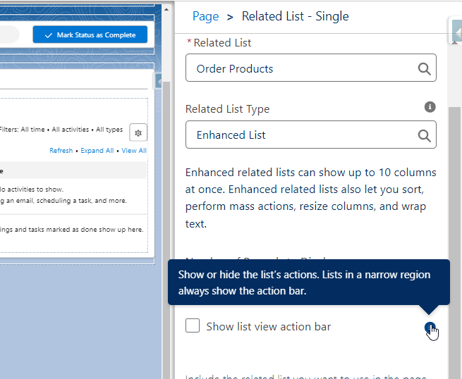 Salesforce does not provide a direct way to hide individual buttons on the Order Products related list, but workarounds exist. Options include using a custom Lightning Web Component (LWC) to control button visibility, overriding standard buttons with Visualforce or LWC, or using duplicate related lists with custom permissions. While permission-based restrictions can prevent actions, they do not remove the buttons, making UI customization the best approach.