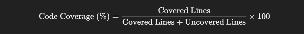 Code coverage is the percentage of executable lines of code that are executed during unit testing. The formula for calculating code coverage is