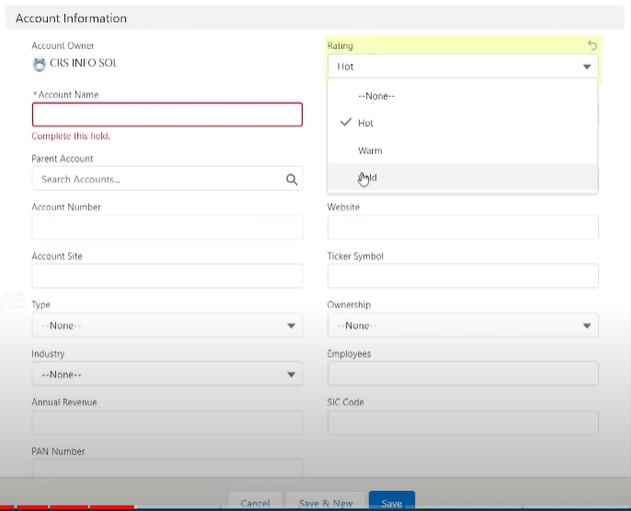 Currently, the Account object doesn’t enforce any rules and allows users to save records with only the account name while all the other fields are left blank.