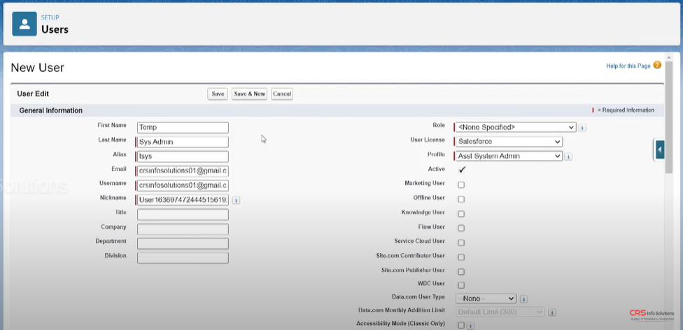 Fill in the details of the user as appropriate. Select their proper user license and profile and set them to “Active.”
