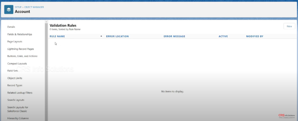 For this, first, go to the Account object on the Object Manager and open the Validation Rules pane. Choose the New option to start creating a new rule.
