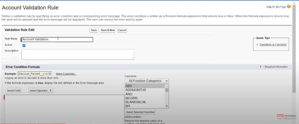 The “Error Condition Formula” is the technical term for the rule. This is where you instruct Salesforce with conditions like: