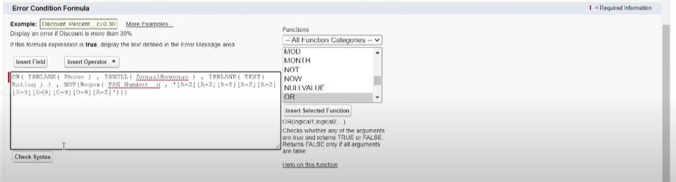 Finally, you can combine all these rules with an OR function to ensure that Salesforce triggers an error whenever any of the above rules are violated by a record.