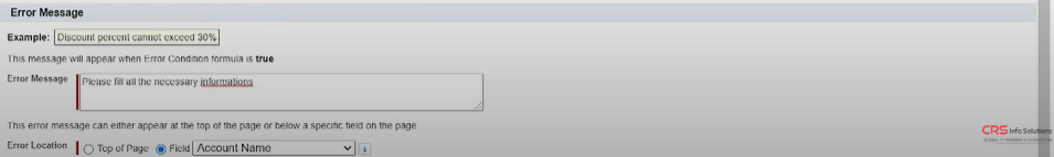 Finally, you need to provide an error message that will be displayed to the user when the validation rule is triggered. This message should clearly explain what needs to be corrected. For our example, the error message could be: “Customer accounts must have an Annual Revenue value.”