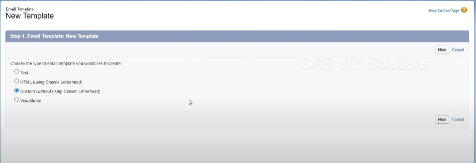 If you want to create a custom email template, click on the New Template button that prompts you to select the template type (text, HTML, custom, or Visualforce).