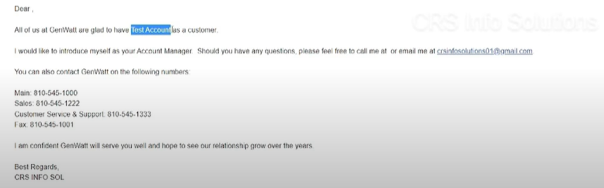 This email uses several dynamic content fields, such as the contact’s first name, account name, and user’s name.