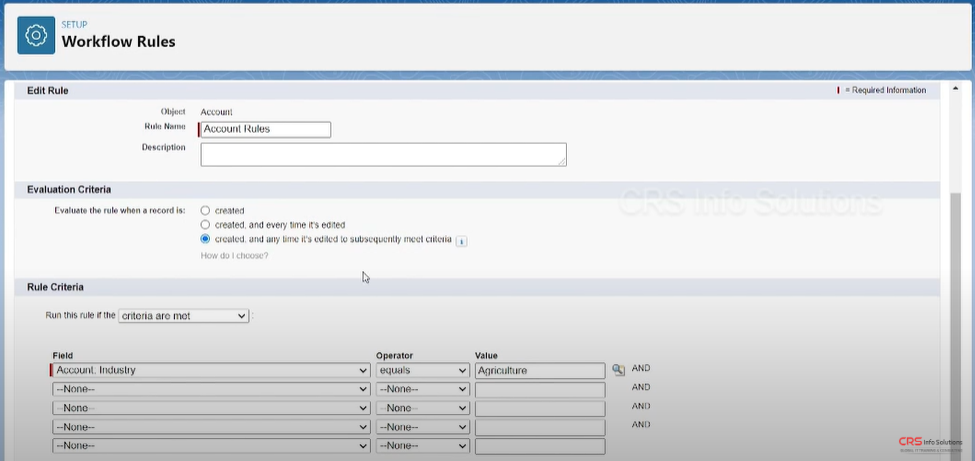 The creation process prompts you to choose the criteria type and define the criteria with relevant fields and the conditions they should meet to trigger the workflow.