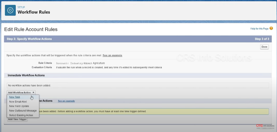 Following the evaluation, the executed action can be either immediate or time-dependent. Examples of actions a workflow can execute are completing a task, sending an email alert, updating a field, or sending an outbound message.