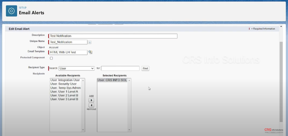 On the other hand, if you want the workflow to send an email, you can set up the email template it should use and the intended recipients as shown below.Â