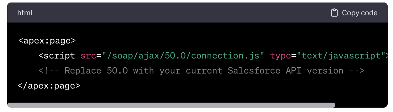 First, you need to include the Ajax Toolkit in your Visualforce page. This is done by adding a script tag that references the Ajax Toolkit resource.htmlCopy code