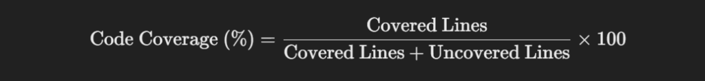 Code coverage is the percentage of executable lines of code that are executed during unit testing. The formula for calculating code coverage is